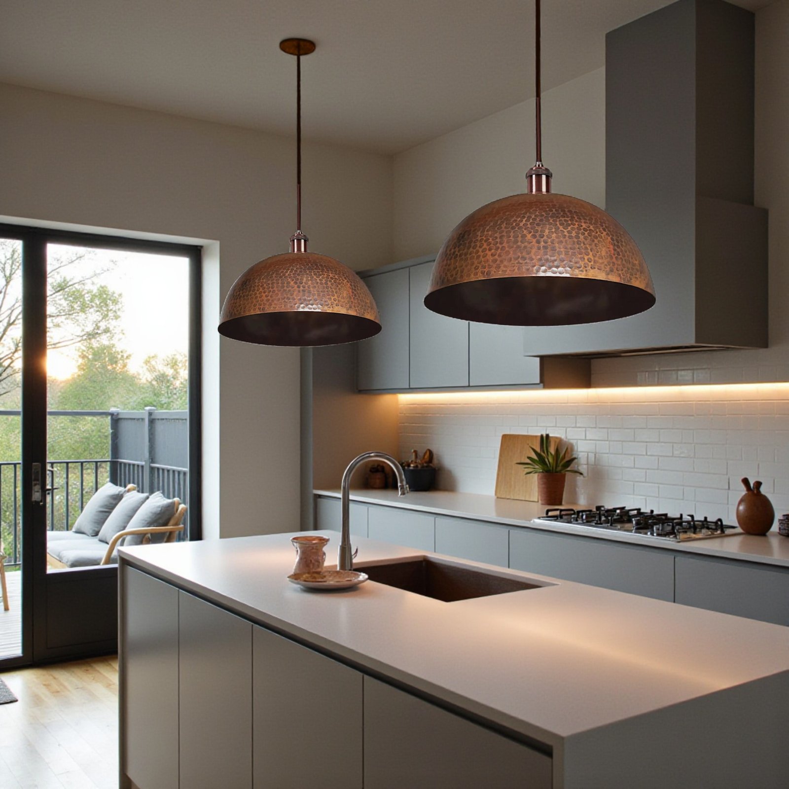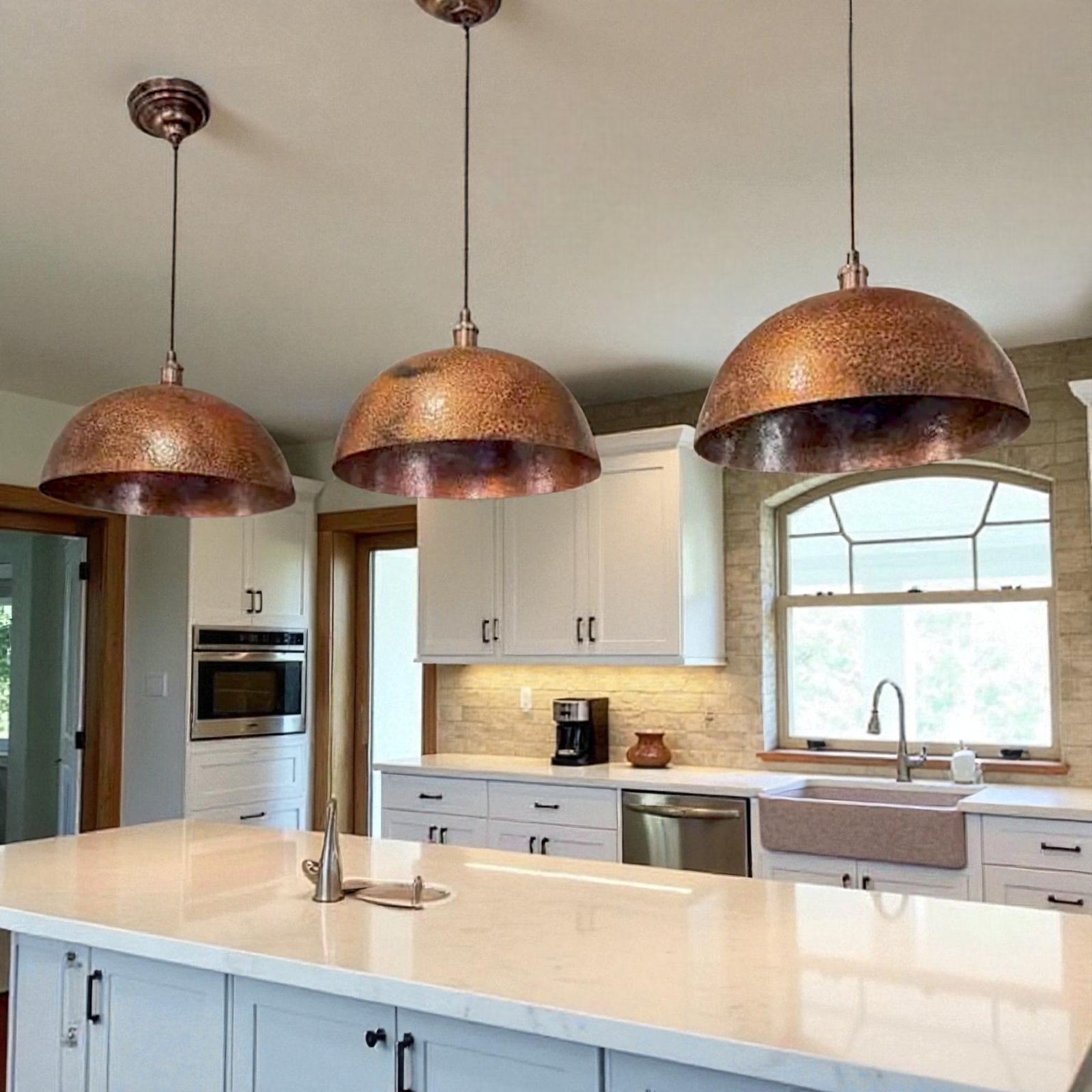 Rustic copper pendant light for kitchen islands with a hammered dome surface, creating warm, inviting light for farmhouse and modern homes.